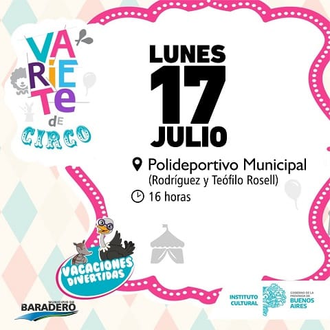 El lunes 17 de julio a las 16 horas en marco de “Vacaciones divertidas”, el Municipio de Baradero a través del Instituto Cultural de la provincia de Buenos Aires llevará adelante “Varieté de Circo” en el Gimnasio del Polideportivo Municipal (Rodríguez y Teófilo Rosell). La entrada es totalmente libre y gratuita.