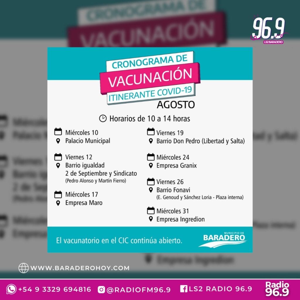 El Municipio de Baradero a través de la Dirección de Atención Primaria de la Salud de la Subsecretaría de Salud informa el cronograma de vacunación que se llevará adelante durante agosto de 10 a 14 horas.