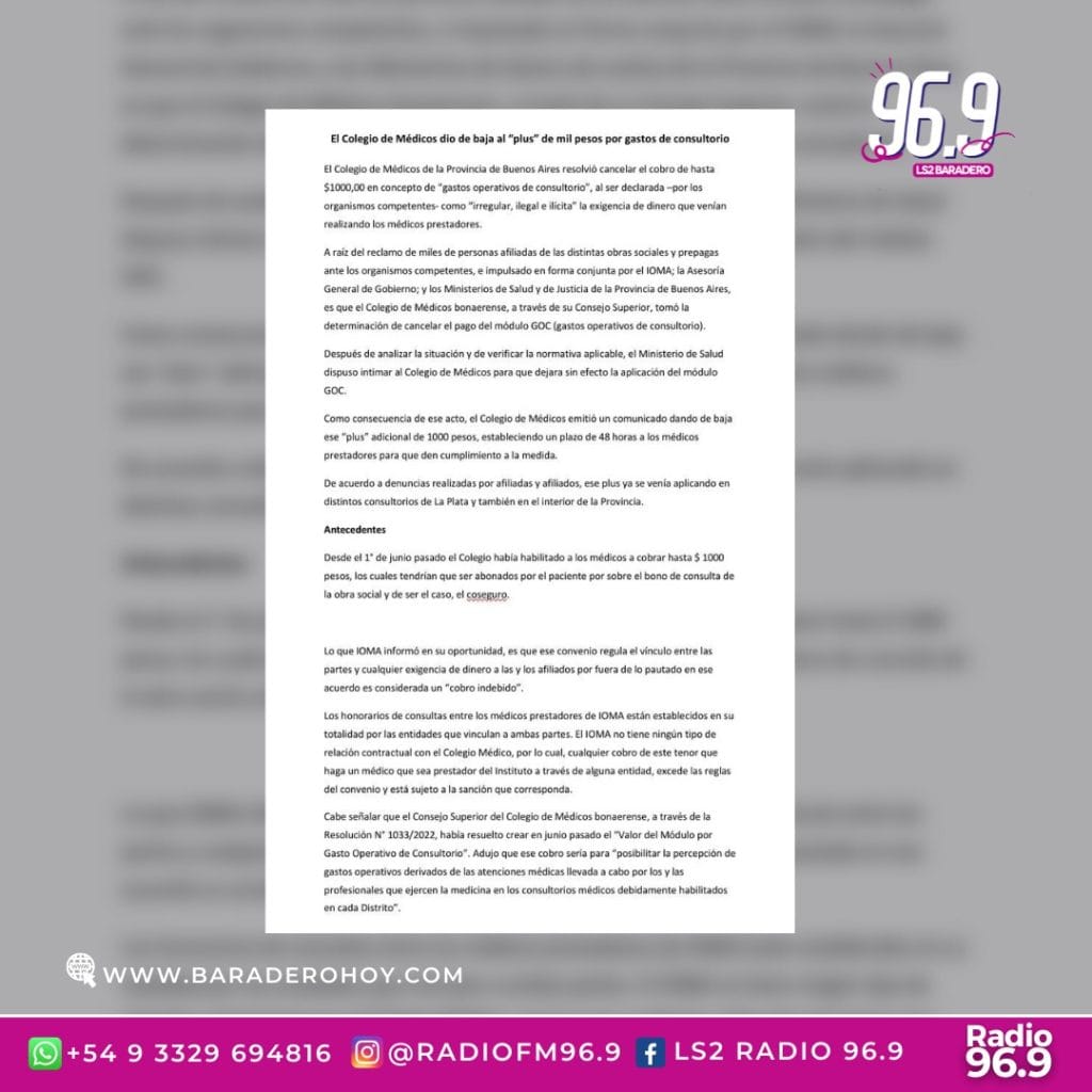 El Colegio de Médicos de la Provincia de Buenos Aires resolvió cancelar el cobro de hasta $1000,00 en concepto de “gastos operativos de consultorio”, al ser declarada –por los organismos competentes- como “irregular, ilegal e ilícita” la exigencia de dinero que venían realizando los médicos prestadores.