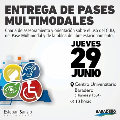 El Municipio de Baradero a través del Departamento de Discapacidad y Adulto Mayor de la Secretaría de Desarrollo Social, informa que el jueves 29 de junio a las 10 horas se realizará en el Centro Universitario Baradero (Thames 1584) la segunda entrega de Pases Multimodales para Libre Transporte.