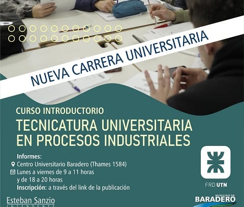 Se trata de la Tecnicatura Universitaria en Procesos Industriales. El curso introductorio será semipresencial y se dictará en el Centro Universitario Baradero (Thames 1584).