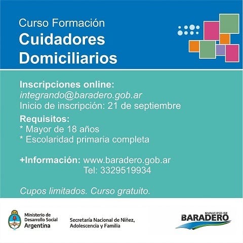 El Municipio de Baradero a través del Departamento de Discapacidad y Adultos Mayores de la Secretaría de Desarrollo Social y del Ministerio de Desarrollo Social de la Nación informa que está abierta la inscripción para realizar el Curso de Formación de Cuidadores Domiciliarios.