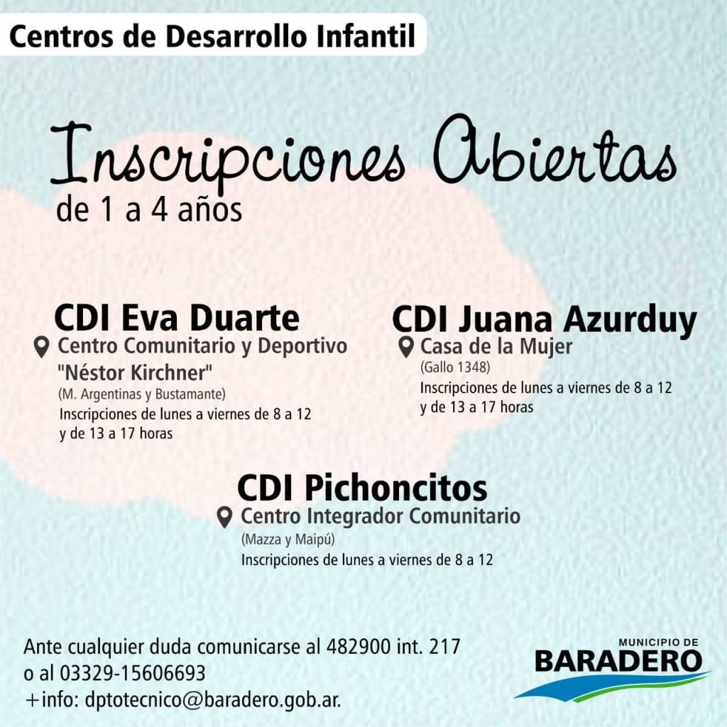 El Municipio de Baradero a través del Departamento de Centros Barriales y Gestión Comunitaria de la Secretaría de Desarrollo Humano comunica que está abierta la inscripción a los Centros de Desarrollo Infantil en los centros barriales, que brindan atención integral para el desarrollo de niñas y niños de 1 a 4 años de edad.