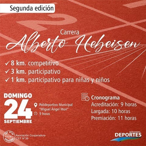 El domingo 24 de septiembre se desarrollará en el Polideportivo Municipal “Miguel Ángel Mori”, la segunda edición de la Carrera “Alberto Hebeisen”, con tres distancias: una competitiva y dos participativas.