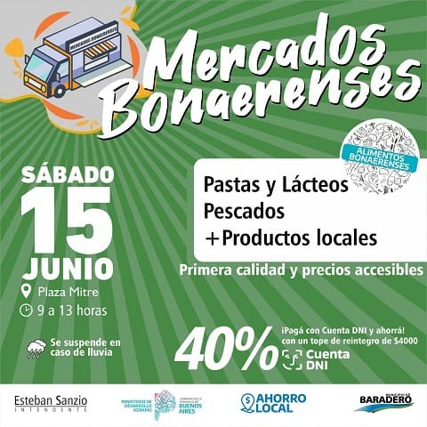 El sábado 15 de junio desde las 9 horas en Plaza Mitre, el municipio llevará adelante una nueva edición de Mercados Bonaerenses que llega con ofertas y descuentos del 40% con Cuenta DNI con tope de reintegro de $4000 por persona.