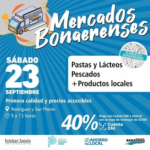 El sábado 23 de septiembre a las 11 horas en San Martín y Rodríguez, el municipio llevará adelante una nueva edición de Mercados Bonaerenses que llega con ofertas y descuentos del 40% con Cuenta DNI con tope de reintegro de $2500 por persona.