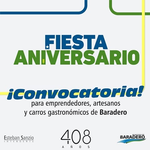 El Municipio de Baradero a través de la Secretaría de Cultura, Turismo, Educación y Deporte informa que se encuentra abierta la inscripción para que emprendedores, artesanos y carros gastronómicos de la ciudad sean parte de la Fiesta Aniversario del 408° aniversario de Baradero.