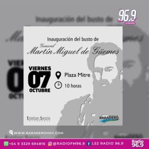 El Municipio de Baradero a través de la Secretaría de Cultura, Turismo, Educación y Deporte informa que el viernes 7 de octubre a las 10 horas en la Plaza Mitre se llevará adelante la inauguración del busto del General Martín Miguel de Güemes.