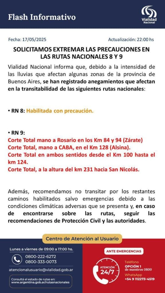 SE HABILITÓ EL TRANSITO EN RUTA 8 PERO SIGUE EL CORTE EN RUTA 9 Mediante un comunicado Vialidad Nacional informó que “Ruta 8 está habilitada pero se solicita circular con precaución”. Sobre Ruta 9, “se mantiene el corte total mano a Rosario en los km 84 y 94 (Zarate)”. La información del organismo agrega que “hay corte total mano a CABA en el km 128 (Alsina) y corte total a la altura del km 231 hacia San Nicolás”. Por último se recuerda que “hay corte total, en ambos sentidos, desde el km 100 al 124”.