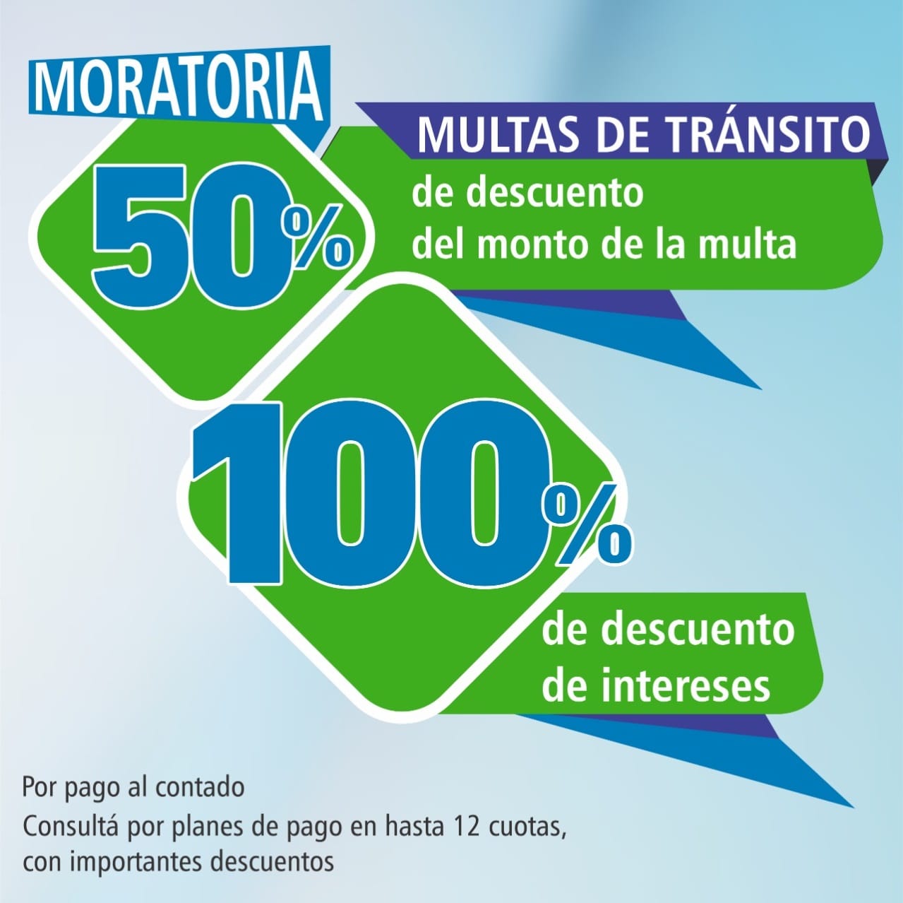 - Pago al contado: 50% de descuento sobre el monto de la multa y cancelación total de intereses.