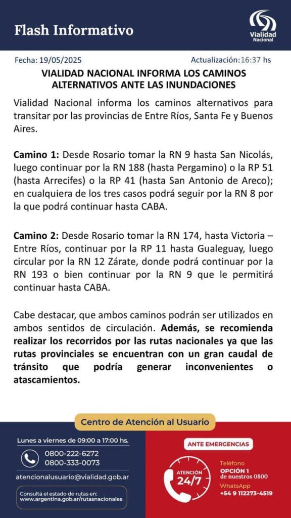 En el informe de esta tarde señala que “hay un corte total de la mano que va a Rosario en los km 84 y 142”.