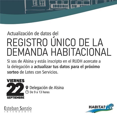 El Municipio de Baradero a través de la Subsecretaría de Hábitat informa que este viernes 22 de septiembre se realizará en la localidad de Alsina la actualización de datos de quienes están inscriptos en el Registro Único de la Demanda Habitacional para el próximo sorteo de Lotes con Servicio.