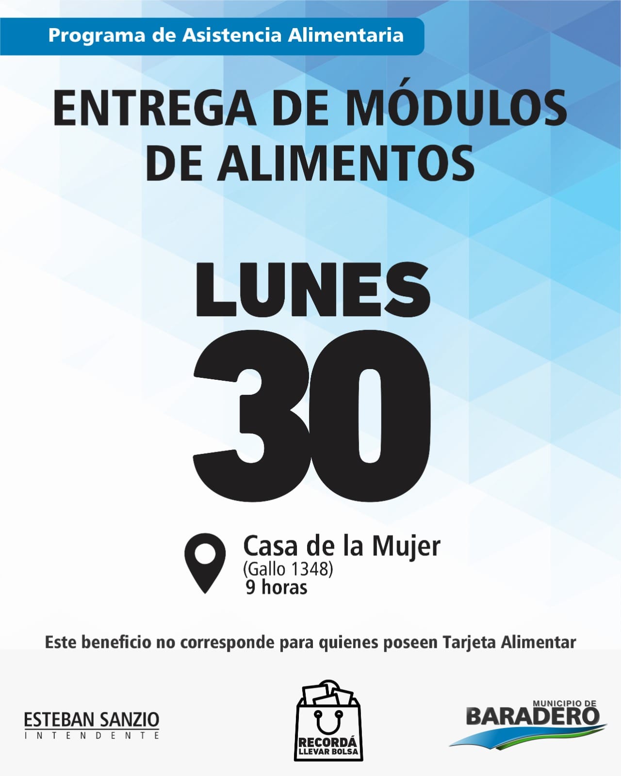 -En el marco del Programa de Asistencia Alimentaria, el Municipio de Baradero, mediante la Secretaría de Desarrollo Social, informa la reprogramación de la fecha de entrega de módulos de alimentos en la Casa de la Mujer (Gallo 1348).