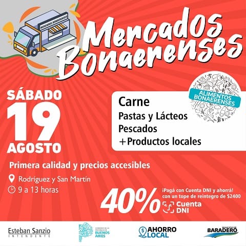 El sábado 19 de agosto de 9 a 13 horas en San Martín y Rodríguez, el municipio llevará adelante una nueva edición de Mercados Bonaerenses que llega con grandes ofertas en carnes y descuentos del 40% con Cuenta DNI con tope de reintegro de $2400 por persona.