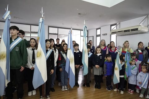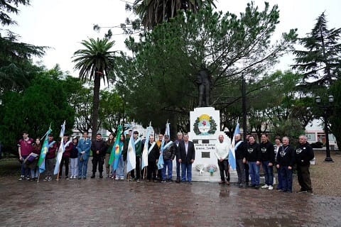 El intendente Esteban Sanzio encabezó el acto conmemorativo que inició con el izamiento de la Bandera Nacional, junto a las estrofas de Aurora. La misma fue izada por el jefe comunal, acompañado por la secretaria de cultura, turismo, educación y deporte, Silvana Iozzia.