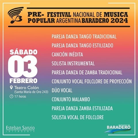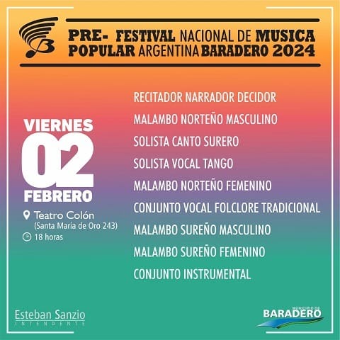 El viernes 2 de febrero a partir de las 18 horas y el sábado 3 de febrero desde las 17 horas, el Teatro Colón será el escenario de una nueva edición de la Final Nacional del Pre-Festival Baradero 2024, de cara al Festival Nacional de Música Popular Argentina que se concretará el 9, 10 y 11 de febrero en el Anfiteatro Municipal.