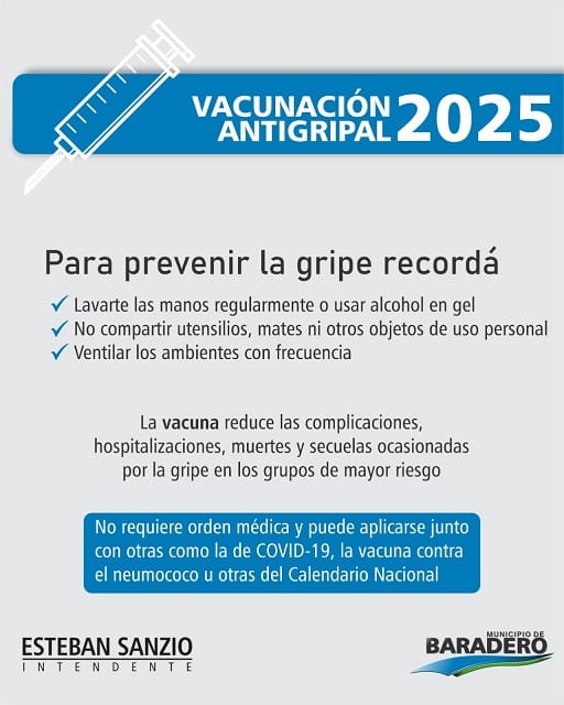 El Municipio de Baradero, a través de la Secretaría de Salud, informa a la comunidad el inicio de la Campaña de Vacunación Antigripal 2025.
